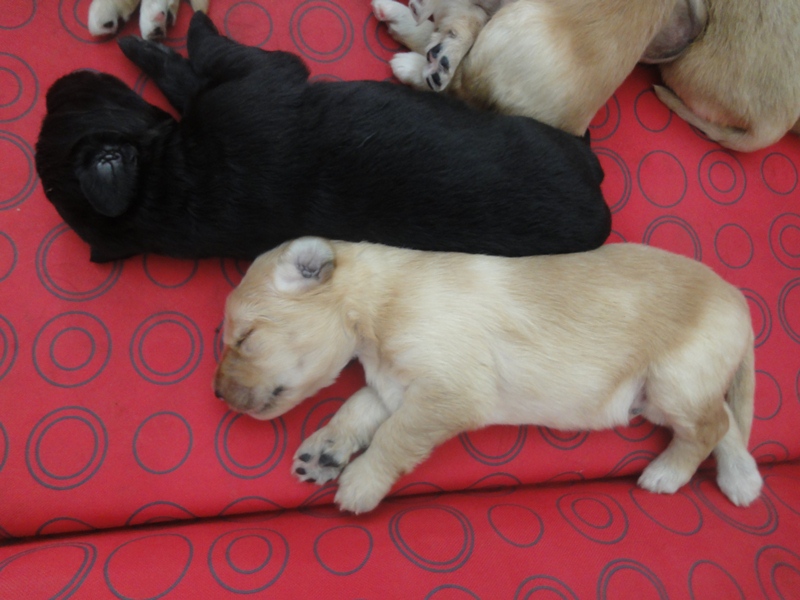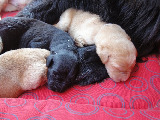 Krytie prebehlo 23.3.2012, šteniatka sa narodili 23.5.2012 v zložení 5 plavých psíkov,1 plavá fenka, 1 čierny psík a 2 čierne fenky.
