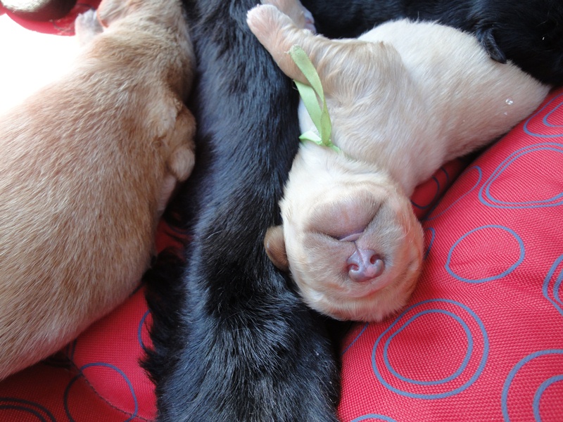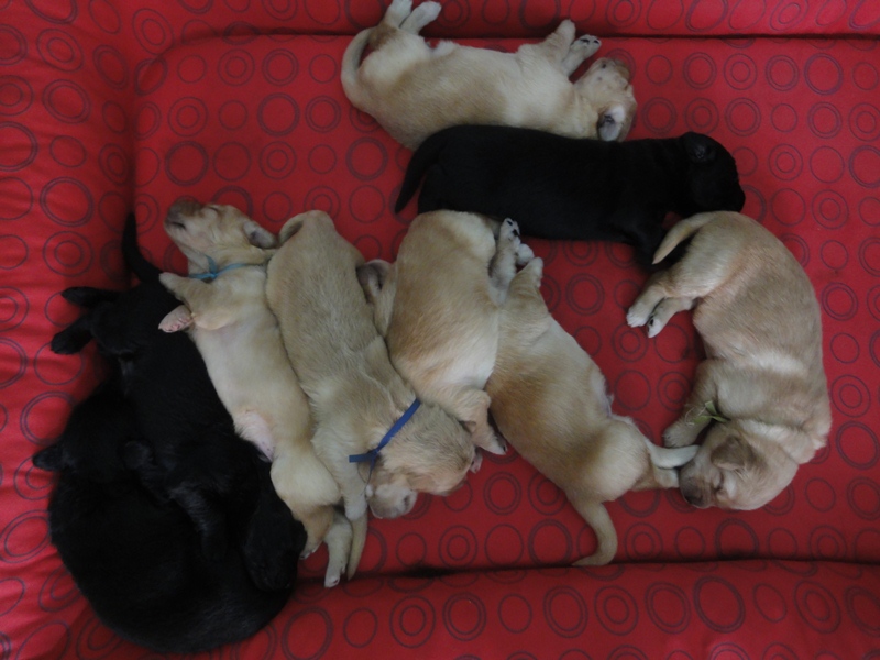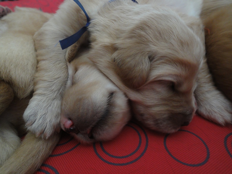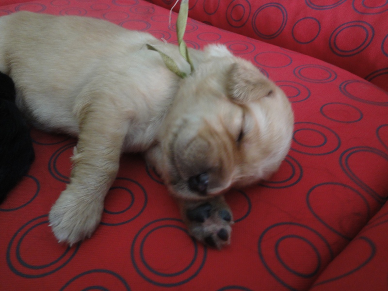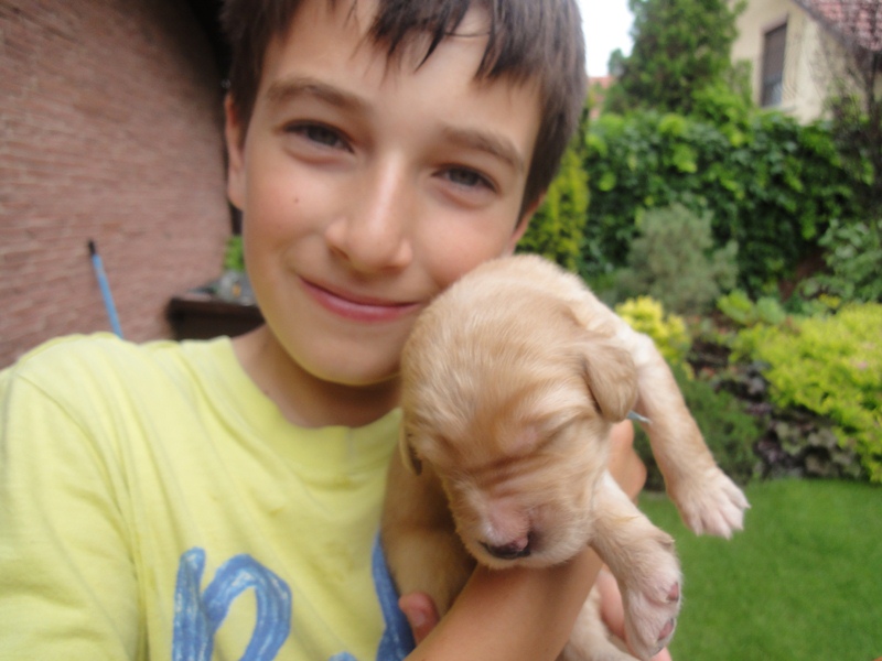 Dnes majú šteniatka za sebou čipovanie, očkovanie a zajtra ich tretí krát odčervíme. U veterinára sa správali ako doma, najviac sa im páčil kocúr, ktorý pred nimi ako inak - stále unikal. Asinka sa so šteniatkami pekne hrá a začína ich aj vychovávať, takže sem tam počuť vrčanie a pišťanie. Ešte ich sem tam kojí, ale už je to pre ňu zjavne nepríjemné, čo sa jej teda vôbec nečudujem. Samozrejme návštevy sú u nás na dennom poriadku. Šteniatka sa na všetky návštevy náležite tešia. Najviac sa im páči, keď môžu každého dôkladne obžužlať a poťahať za všetko čo sa len dá. Vytiahli sme aj malý tunel po našom Murkovi a očividne im vôbec neprekáža, že bol pôvodne pre mačky. Je prelezený skrz na skrz - za chvíľku z neho budú len framforce. Zopár fotiek z tohto obdobia: www.rajce.net/a6692635